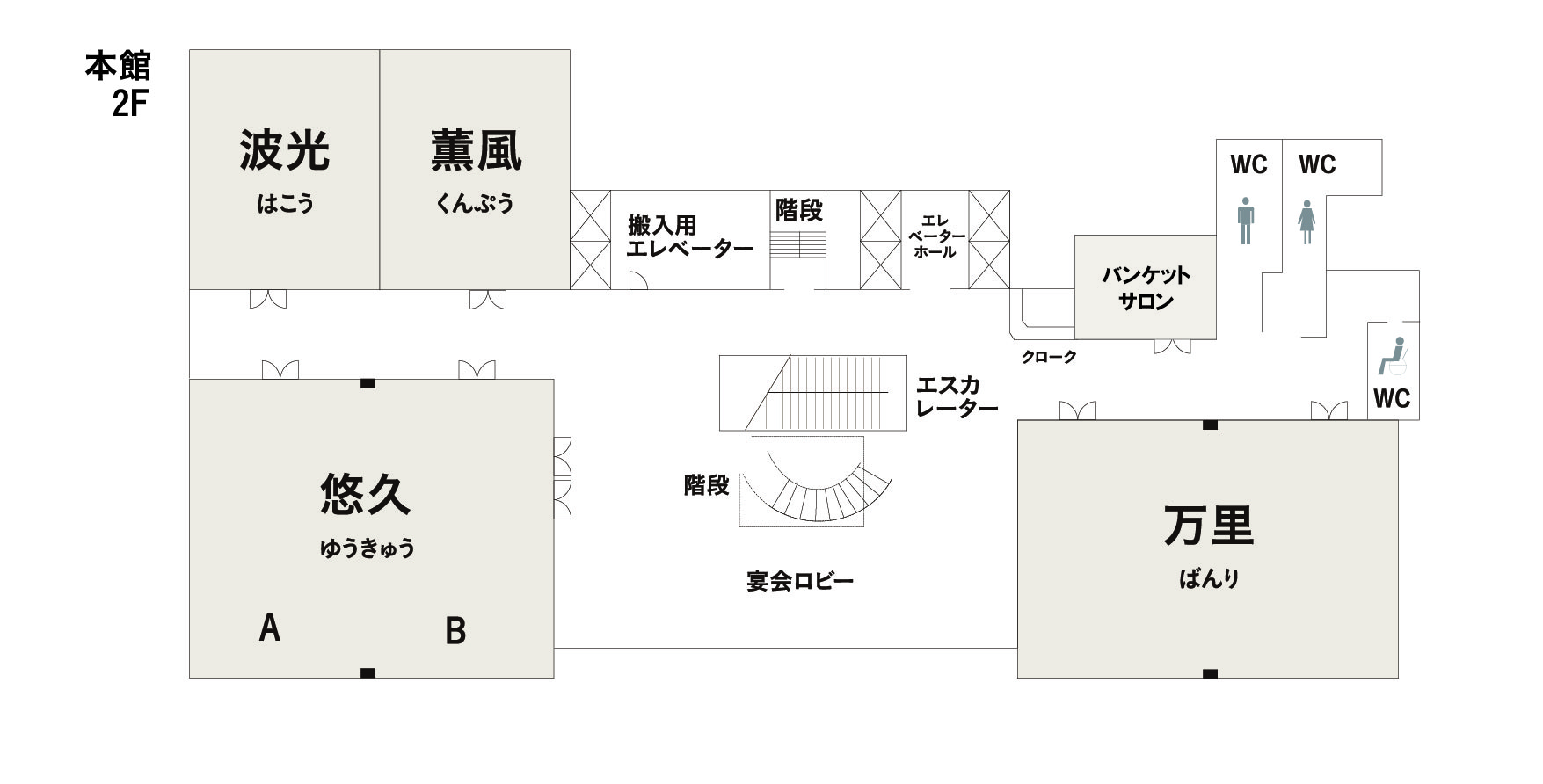 | 中宴会場 | 薫風 | 本館2F | 140 | 42.5 | 11×13 | 2.6 | 70 | 90 | 80 | 160 | 55 | 45 |