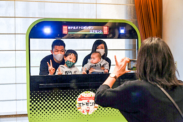 子供駅長制服を着てすっかり駅長気分に。フォトパネルの前で出発進行!!