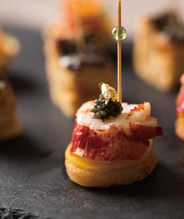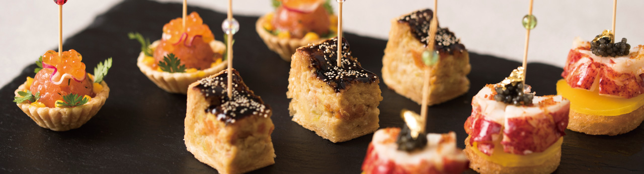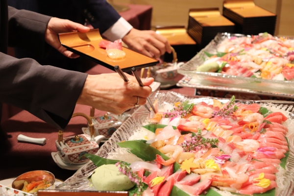西洋料理・日本料理の各専門シェフが、厳選された旬の食材で彩る珠玉のメニュー。ローストビーフのカッティングや握り寿司のライブパフォーマンスなど美しい手さばき。視覚的にゲストの心に刻まれるダイナミックな演出が可能です。「味」と「記憶」に残る、ワンランク上の宴を実現します。