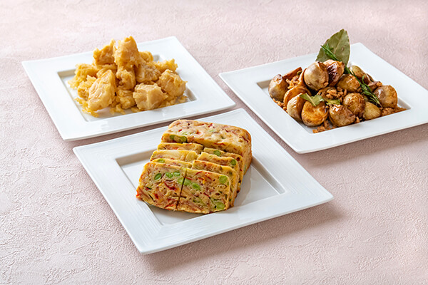 3月のランチブッフェでは、「鱈とあさりの白ワイン蒸し 春菊のジェノベーゼソース」や「スモークサーモンとフランボワーズのマリネ」など素材の旨味を活かしたアレンジ料理が楽しめるほか、筍の天麩羅、春野菜のケークサレ、新じゃがいものローストと大豆ミートなど春野菜をふんだんに使用した「春野菜のセレクション」など、彩り豊かなお料理を約60種類ご用意しております。