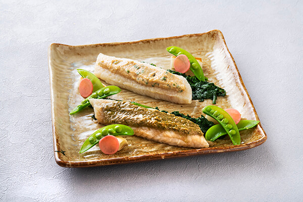 ・白身魚のガーリックオイル焼 柚子ととんぶり入りラビゴットソース
