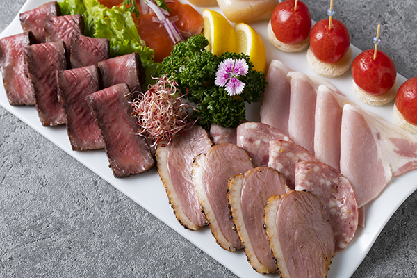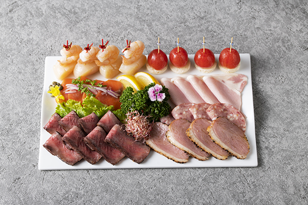 ローストビーフと、ハムやサラミなどのシャルキュトリ、スモークサーモンなどを盛合せた、ワインによく合うエドモント特製のオードヴルプレートです。