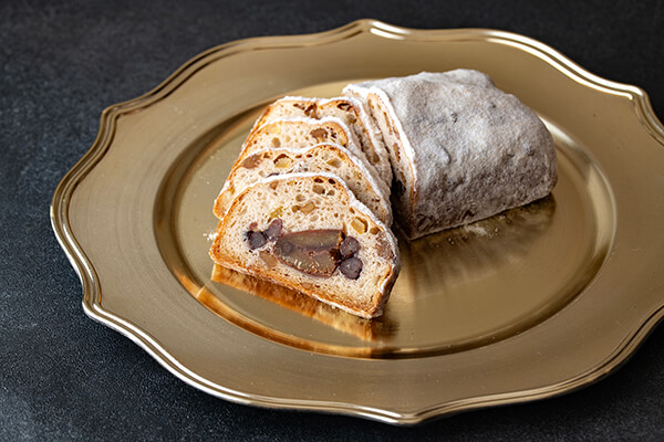 ドライフルーツやナッツをふんだんに使用した王道のシュトレン。マジパンを生地に練りこむことで、しっとりとした口当たりに仕上げました。