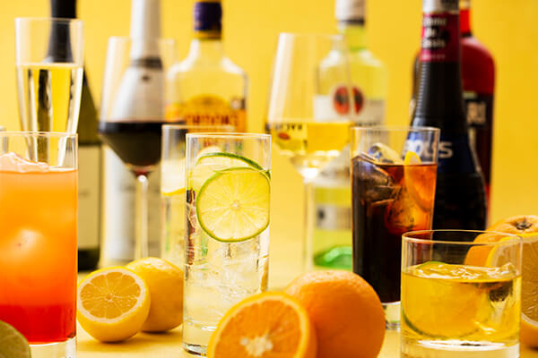 ビール、ワイン(赤・白)、ウィスキー、焼酎、日本酒、梅酒、サワー、カクテル、ソフトドリンクなど