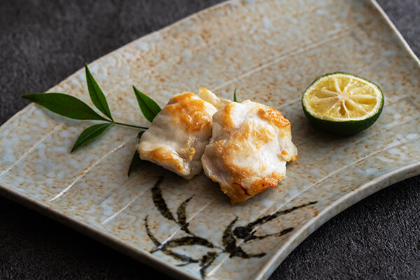 淡白ながらも奥深い旨味が凝縮したふぐを、目の前の鉄板でふっくらと焼き上げます。